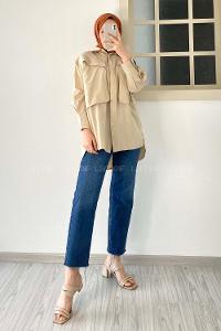 Modalamelif Asimetrik Bombe Cep Detaylı Gömlek Bej