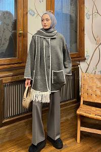 Lamelif Atkı Detaylı Triko Hırka Gri