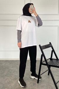 Modalamelif Ayıcık Baskılı Oversize T-Shirt Beyaz