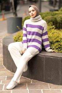 Modalamelif Balıkçı Yaka Şerit Desenli Renk Garnili Triko Kazak Gri-Mor