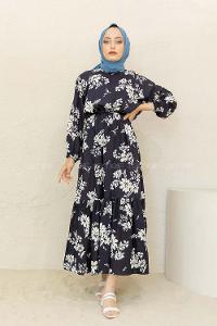 Lamelif Balon Kol Katlı Tesettür Elbise Lacivert