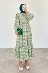 Modalamelif Balon Kol Ekose Elbise Çağla Yeşili