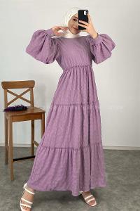 Lamelif Balon Kol Gofre Büzgülü Elbise Eflatun
