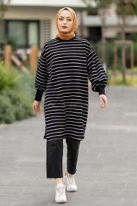 Modalamelif Balon Kol İnce Çizgili Tunik Siyah
