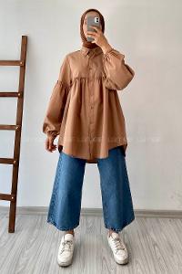 Modalamelif Balon Kol Önü Boydan Düğmeli Büzgülü Gömlek Sütlü Kahve