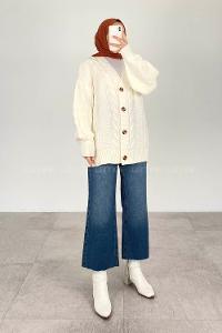 Modalamelif Balon Kol Örgü Desen Ön Düğmeli Hırka Ekru
