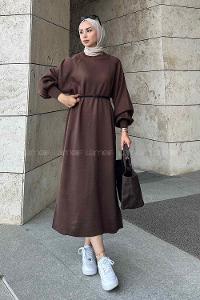 Lamelif Balon Kol Katlı Tesettür Elbise Acı Kahve