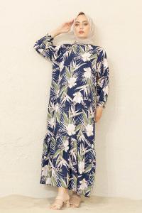 Modalamelif Balon Kol Yaprak Desenli Elbise Lacivert