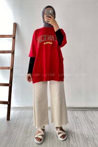 Modalamelif Beanıcon Yazılı Yan Yırtmaçlı Oversize T-Shirt Kırmızı