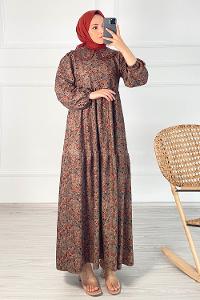 Lamelif Ön Yarım Düğme Detaylı Müslin Kumaş Tesettür Elbise Kum Beji