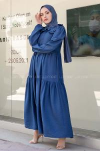 Lamelif Balon Kol Katlı Tesettür Elbise Saks Mavisi