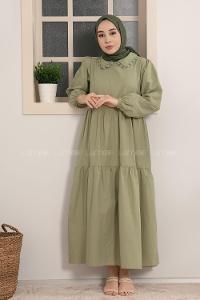 Lamelif Balon Kol Bağlamalı Tesettür Elbise Haki