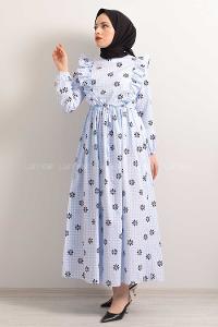 Modalamelif Bel Bağcıklı Papatya Desen Elbise Açık Mavi