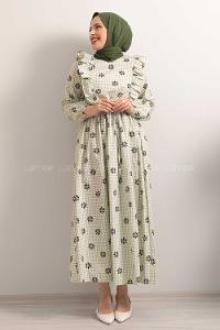 Lamelif Düğmeli Yarasa Kol Etnik Desen Tesettür Elbise Yeşil