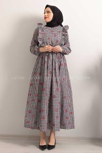 Lamelif Balon Kol Katlı Tesettür Elbise Acı Kahve
