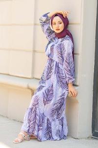 Modalamelif Bel Büzgülü Yaprak Desen Elbise Lila