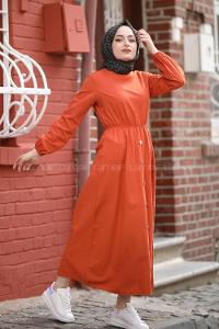 Modalamelif Bel Büzmeli Keten Elbise Kiremit
