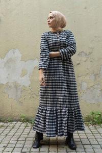 Modalamelif Bel Lastikli Ekose Elbise Gri Siyah