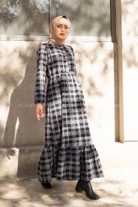 Modalamelif Bel Lastikli Ekose Elbise Siyah Gri