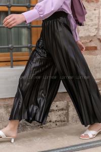 Modalamelif Bel Lastikli Pileli Deri Görünümlü Pantolon Siyah