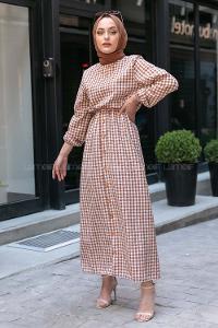 Lamelif Ekose Desen Elbise Taş Rengi
