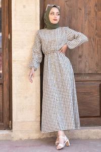Lamelif Taş Detaylı Tesettür Elbise Soft Kahve