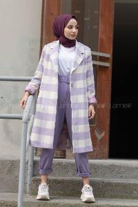 Modalamelif Belden Bağlamalı Ekose Kaşe Kaban Lila