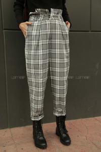 Modalamelif Beli Fırfırlı Düğme Detaylı Kareli Ekose Pantolon Gri