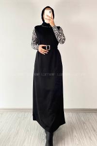 Lamelif Bisiklet Yaka Triko Tesettür Elbise Siyah
