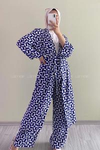 Modalamelif Beli Kuşak Bağlama Detaylı Desenli İkili Takım İndigo