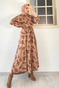 Modalamelif Beli Kuşak Bağlamalı Çiçek Desenli Elbise Kahverengi