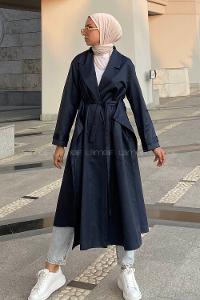 Modalamelif Beli Kuşak Bağlamalı Düğme Detaylı Trenç Lacivert