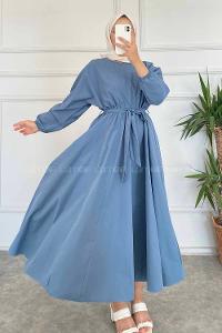 Modalamelif Beli Kuşak Bağlamalı Mevlana Elbise İndigo