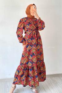 Modalamelif Beli Kuşak Detaylı Çiçek Desen Elbise Kırmızı