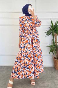 Modalamelif Beli Kuşak Detaylı Çiçek Desen Elbise Lacivert-Oranj