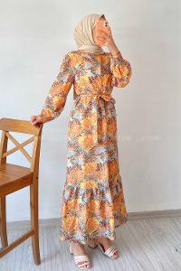 Modalamelif Beli Kuşak Detaylı Çiçek Desen Elbise Oranj