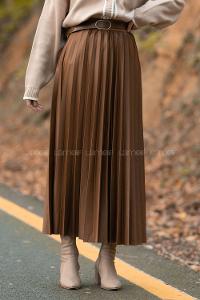 Lamelif Önü Pileli Scuba Kumaş Etek Kahverengi