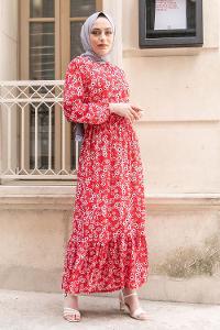 Modalamelif Beli Lastikli Desenli Dokuma Elbise Kırmızı