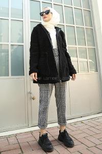 Lamelif Biye Detaylı Tedy Peluş Mont Siyah