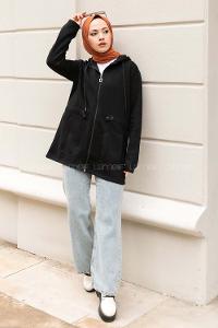 Modalamelif Beli Lastikli Kapüşonlu Hırka Siyah