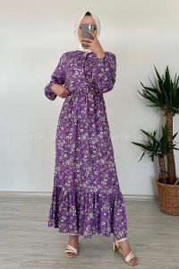 Modalamelif Beli Lastikli Papatya Desen Elbise Eflatun