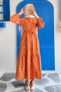 Modalamelif Beli Tunelli Papatya Desen Elbise Oranj