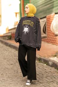 Modalamelif Berkeley Yazı Baskılı Çizgi Desenli Sweat Siyah-Beyaz