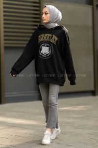 Lamelif Kapşonlu Oversize Yan Cepli Sweat Siyah