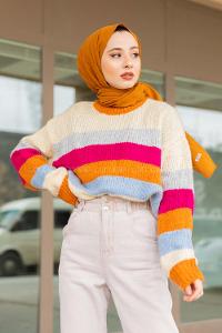 Modalamelif Beş Renk Şeritli Kazak Oranj
