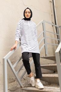 Modalamelif Beyaz Çizgili Kapşonlu Sweat Beyaz