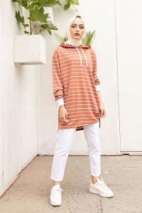 kapüşonlu, çizgili, etek ucu küçük yırtmaçlı sweat.