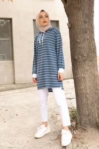 Modalamelif Beyaz Çizgili Kapşonlu Sweat İndigo