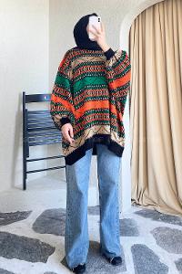 Modalamelif Bisikelt Yaka Salaş Desenli Kazak Oranj-Yeşil