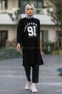 Modalamelif Bisiklet Yaka California Yazı Baskılı Yırtmaçlı Tunik Siyah